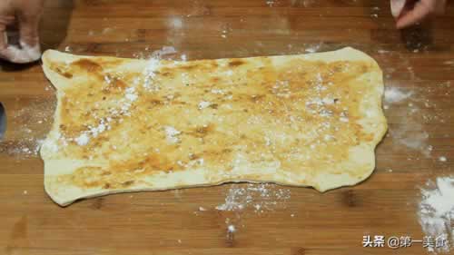 4.把准备好的油酥倒在面片上,用刮板刮均匀,油酥不要抹太多,薄薄的一层即可,太多的话,我们卷的时候容易把油酥挤出来,然后撒上一层干面粉,方便烧饼分层。