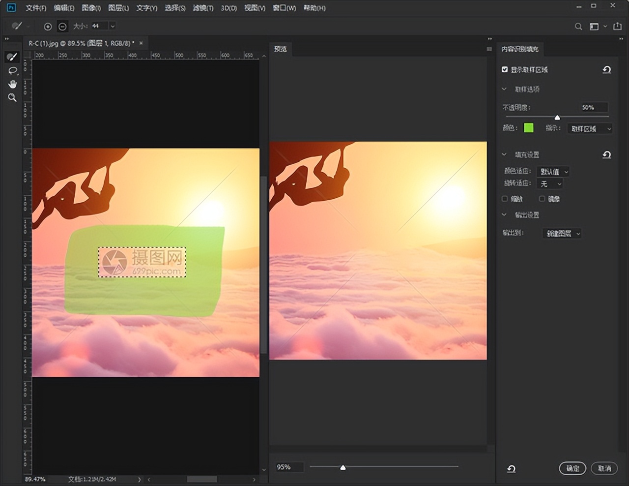 8.这时候你会看到如下区域,绿色的部分代表软件所需要进行计算识别的部分,以我们的素材为例,其实只需要水印周围一圈来进行智能填充就好了,所以我们用画笔工具擦除其他多余部分。