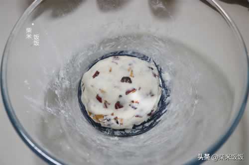 4,把切好的红枣和蔓越莓干倒入大碗中,再放入约50克的糯米粉。山药泥的含水量不同,所用到的糯米粉也不同,可以少量多次加入,具体用量大家根据实际情况自己调整。