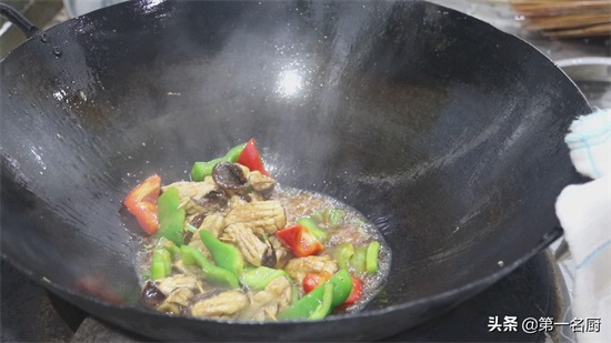 另起锅添入少许食用油,倒入葱蒜爆香,加入蚝油3克,搅拌化开,倒入青红椒块,快速翻炒片刻,炒至配菜断生以后,淋入半勺清水,加入老抽几滴调色,搅拌几下。