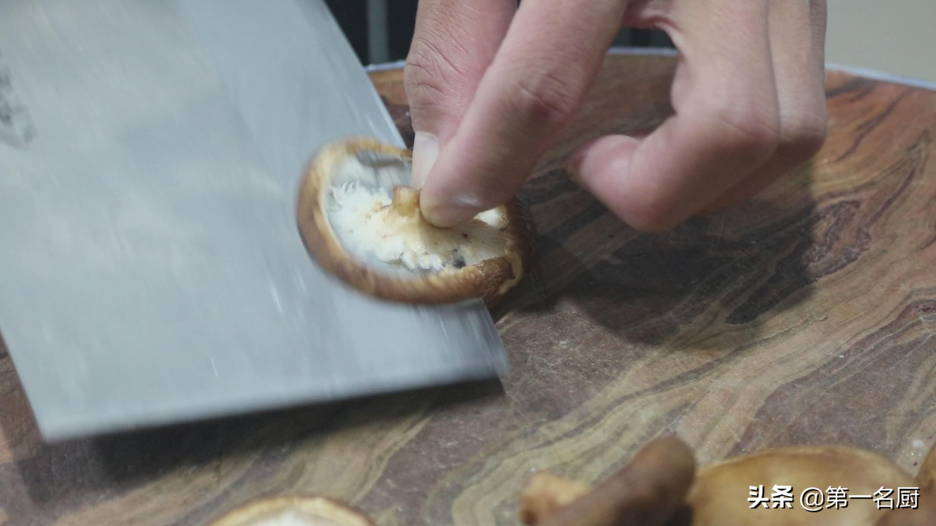 然后把控水后的香菇,平放在菜板上,用刀在香菇表面间隔3毫米切开,斜切至四分之三,注意不要切透,再用直刀十字交叉切一遍,切好以后卷起来,用牙签固定,然后再放在盘中备用。