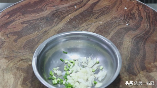 准备小葱一根切成葱花,放入小盆中,大蒜几粒拍扁切成蒜末,一起放入盆中备用。