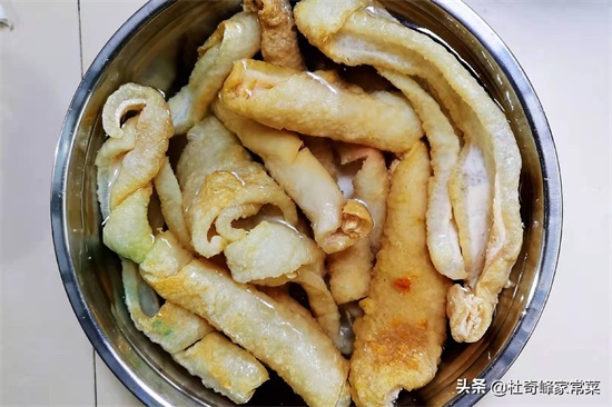 待听不到响声,开盖翻面,同时用漏勺配合筷子,把粘连的猪皮分开,继续炸至金黄色,捞出控油。等待油温重新升高,放入猪皮复炸至起“荔枝花”,这过程不能太长,10秒钟左右,否则会糊,然后捞到盆里,加入清水浸泡。