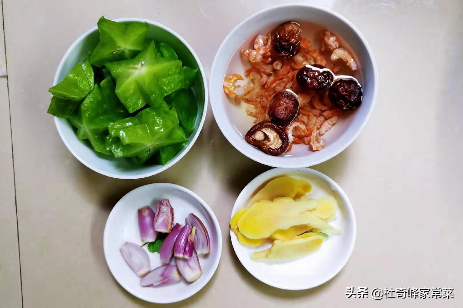 (1)姜洗干净切片。红葱头切去两头,撕去皮切片。杨桃洗干净,切去棱边,然后切片。虾米,香菇放入碗里,加入清水浸泡。