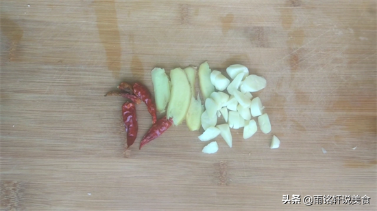 2准备姜切片,蒜切碎,辣椒切小段。