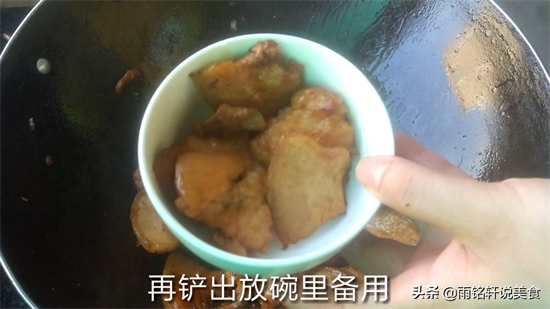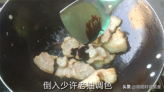 6锅烧热,倒入五花肉煸炒,中火把它炒至出油,把五花肉尽量炒干一点,这样吃起来才更香;然后倒入老抽调色,再翻炒均匀铲出放碗里备用。