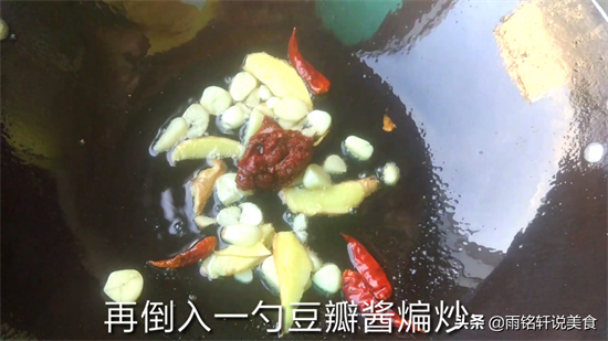 7再起锅烧油,放姜片、干辣椒、蒜头、豆瓣酱炒香,然后倒入花菜翻炒均匀。