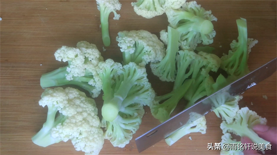 1把整棵的花菜切一半下来,再用刀把它切小朵,用手撕也可以,全部切好再清洗干净。