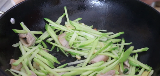 5、起锅烧油,先放入葱姜蒜,五花肉炒出香味,香味出来了之后将萝卜丝放进去开始翻炒一下,将它们翻炒均匀之后再向里面加上适量的生抽和老抽,继续翻炒一下,接下来再向里面加上一点食盐,胡椒粉调味。