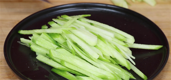 3、接下来再把咱们准备好的青萝卜取出来,先将青萝卜洗净,然后再去掉外皮。去完外皮之后将其头尾全部切掉,切完头尾之后再将其切成片,最后切成细丝。萝卜切完细丝之后将它们放到一个碗中备用,然后再来切一点蒜片,姜片和葱段,切完了之后同样是放到碗中备用。