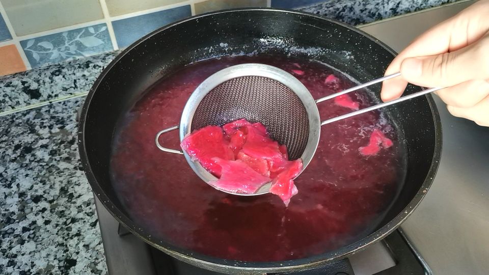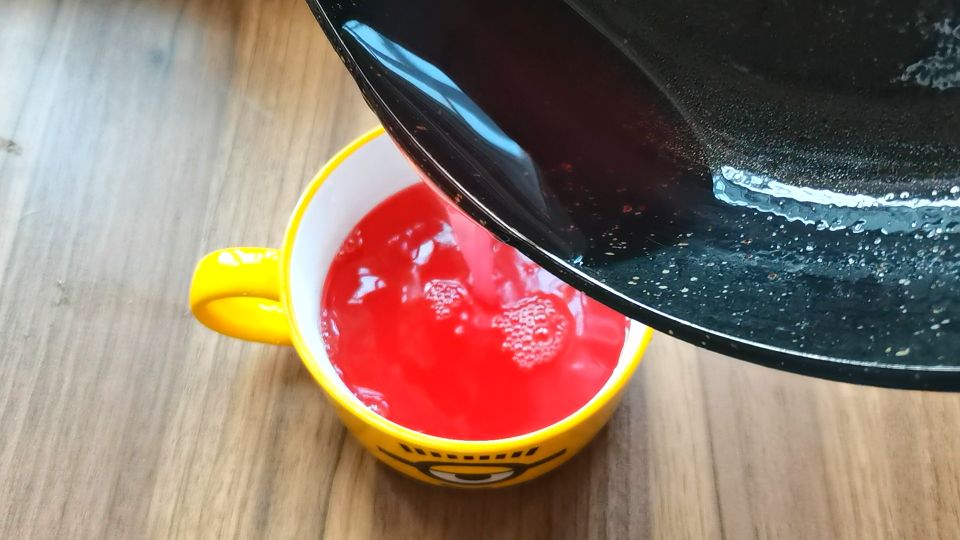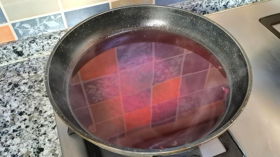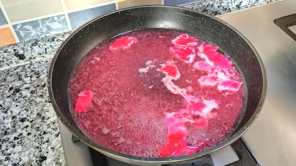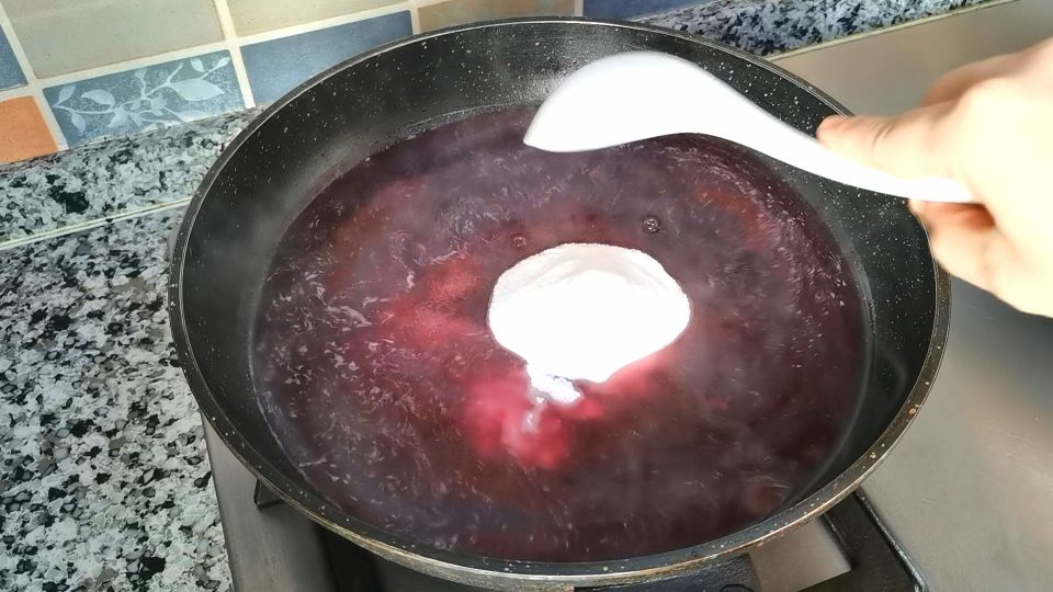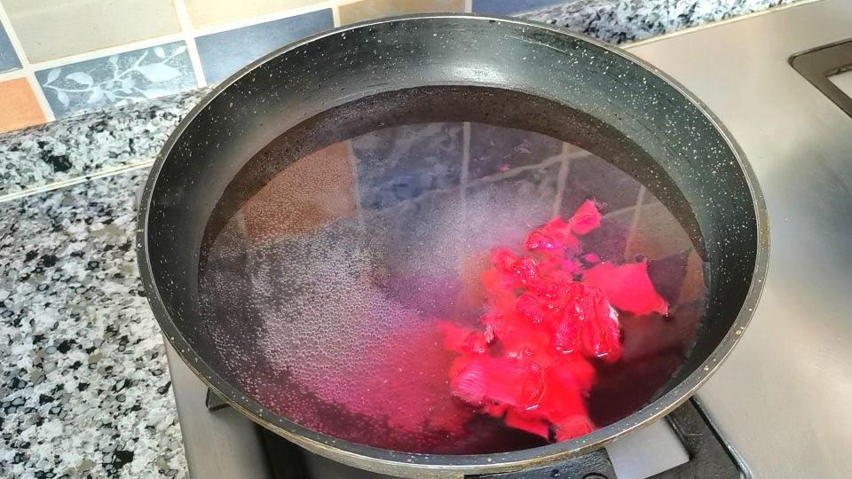 2,锅中加500毫升清水,30克白糖,倒入刚刮出来的火龙果皮,煮开,煮出颜色。
