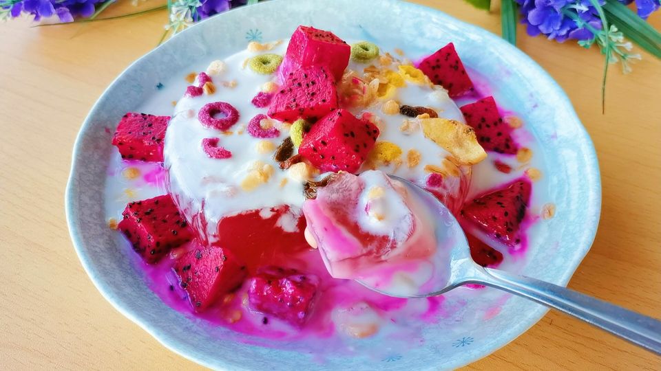 8,撒一层水果燕麦,再加点火龙果做点缀。