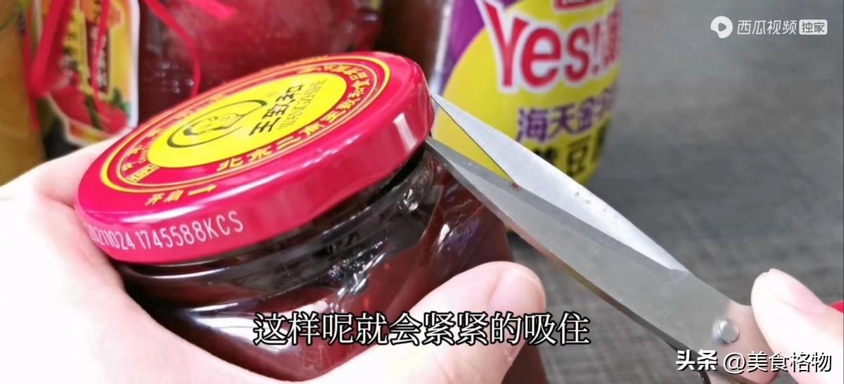 这次我们要用到一个小工具,一把小剪刀,用剪刀尖在瓶子和罐头盖之间找一点点缝隙,从这个缝隙处插入剪刀的尖儿,稍微给它撬一撬,只要这个空气能够进去一点,这个瓶盖就会特别方便可以拧开,这就像是我们平时去拔罐一样,拔罐的时候罐子里面的气比较少,这样就会紧紧的吸住,而在个我们给它放气之后,罐子就会特别轻易的可以直接被拿下,用剪刀轻轻给它放过一点点气之后,在拧罐头瓶的时候就可以非常轻易的拧开。最开始的时候罐头瓶的盖子是凹陷进去的,放完气之后,罐头瓶盖就会鼓出来,这样在拧的时候就会特别方便。