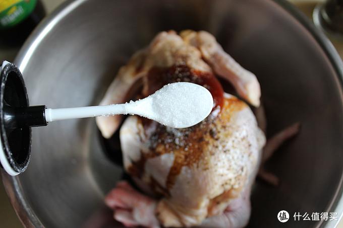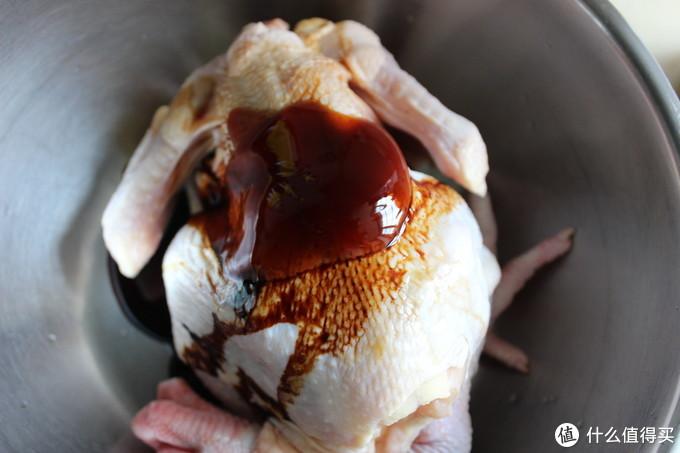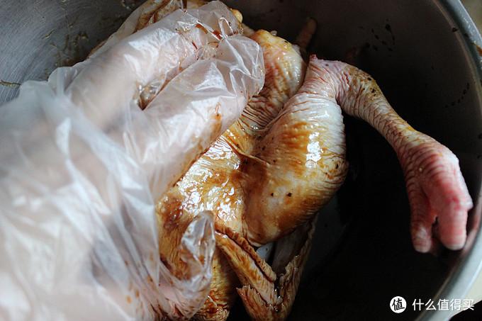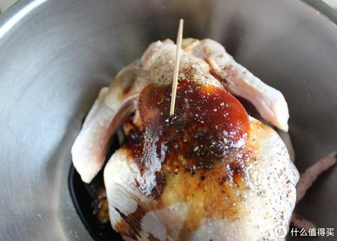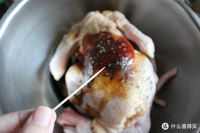 用牙签或者叉子在鸡表面扎出一些小洞帮助入味