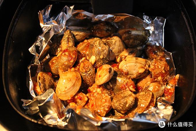 将准备好的花蛤放入铺好锡纸的炸蓝中,