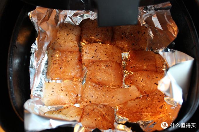 空气炸锅预热180°,放入腌制好的三文鱼烤15分钟,中途借助铲子给三文鱼翻一次面就可以了
