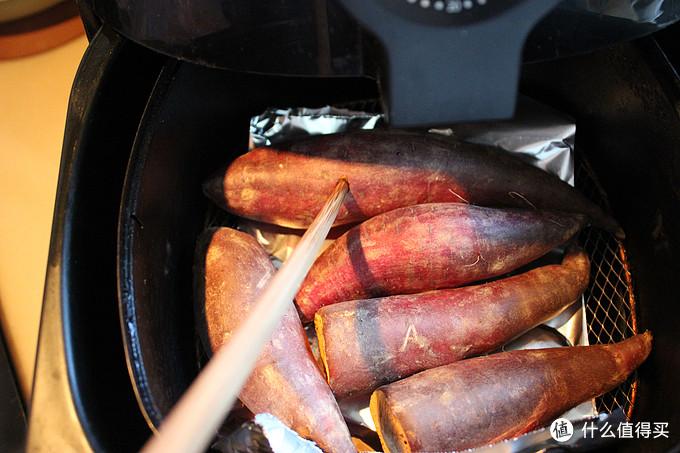 楼主这些红薯不是很大,所以烤了15分钟。空气炸锅停止工作后拉出炸蓝
