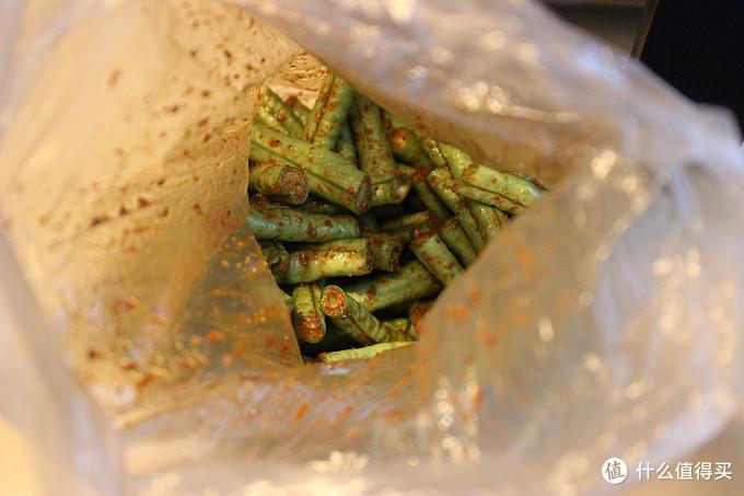 避免你们说我唠叨,我就把洗菜和切菜的步骤省略了。直接将洗净切好擦干的豆角放入保鲜袋中,加少许油,盐,烧烤料晃匀