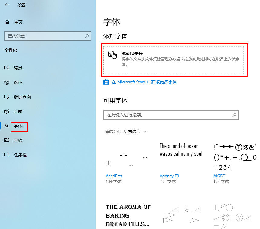 l 添加字体:将下载后的字体拖放到此框中,就是添加字体的方法。(常用设置)