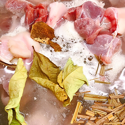 6、放入陈皮、香叶、香茅草