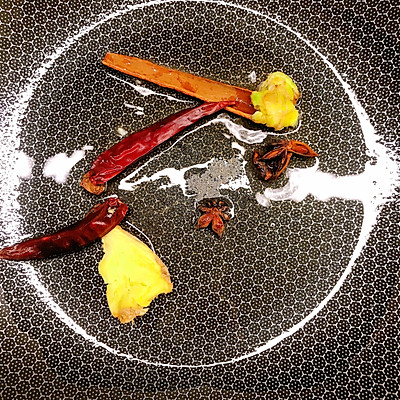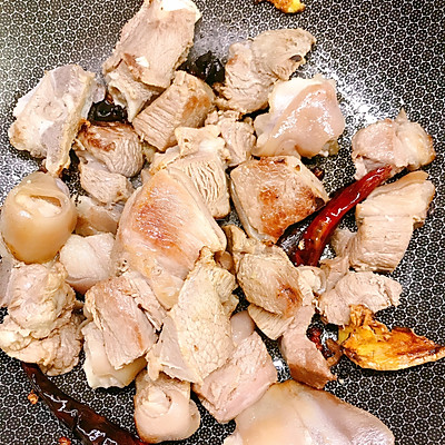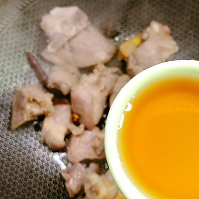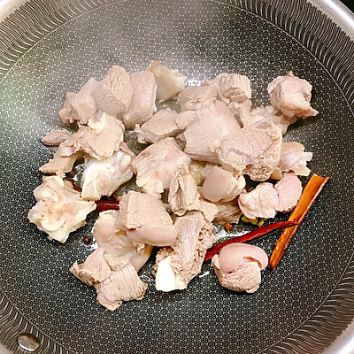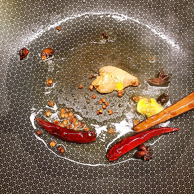 10、锅中放油烧热炒香生姜、山奈八角桂皮干辣椒