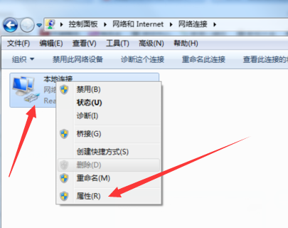 4、找到“本地连接”图标。选定“本地连接”后鼠标左键双击或者右键属性。