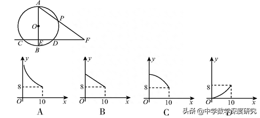【解析】分别连接OC,AC,CP,在Rt△OCE中,OE=3,在Rt△ACE中,有勾股定理可求得AC=4√5,易证△ACP∽△AFC,∴AC²=AP·AF,即xy=80,y=80/x ( 0<x≤10 ),A项正确.
