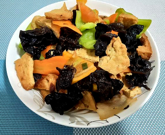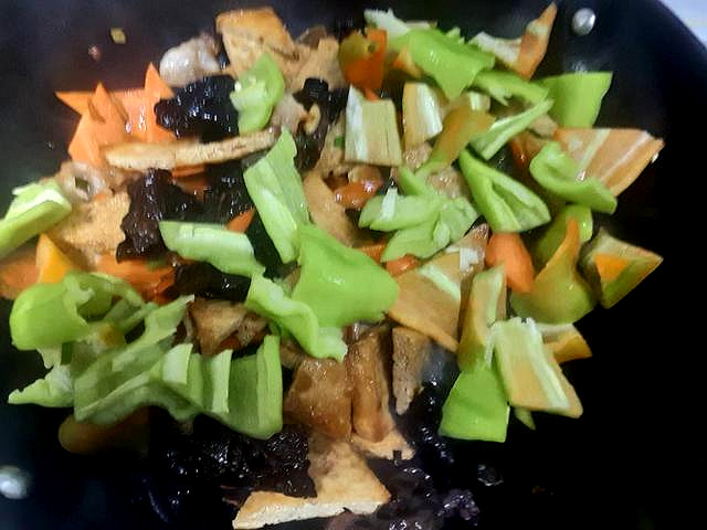 尖椒两个、炸豆腐适量、胡萝卜半根、木耳适量、五花肉适量、大蒜三到四瓣、香葱适量、食用盐适量、食用油适量、生抽适量