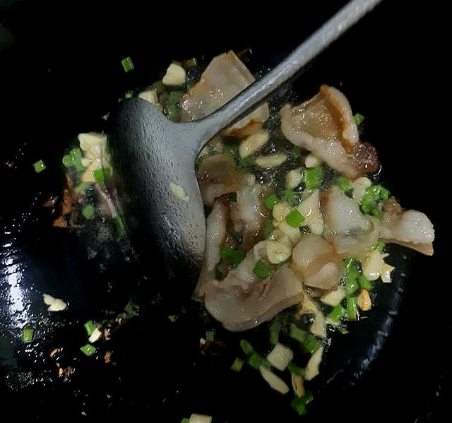 第三步:锅中放入适量食用油,油温五成热下入五花肉煸炒出多余油脂,然后放入葱蒜炒香;