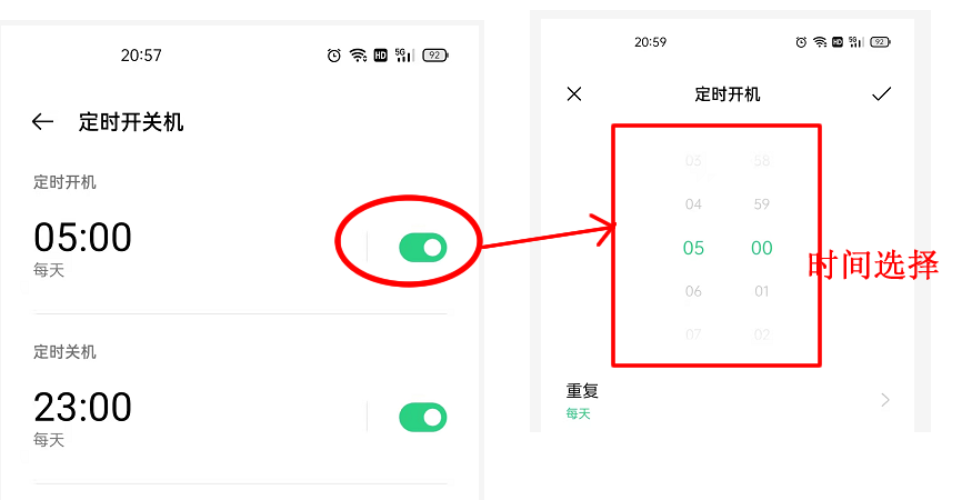在定时开关机选项只有2个选项,定时开机和定时关机选项,只有打开绿色开关后,才能设定时间,请定义好自己休息的时候段,在睡眠的时间内,手机完全关机。