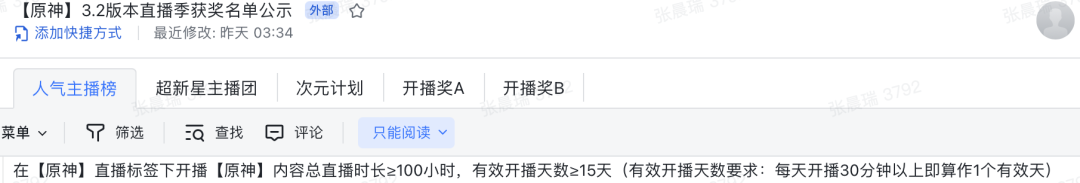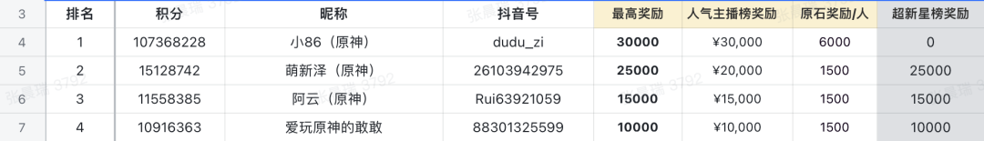 (数据均来自 3.2 版本《原神》直播季获奖名单表格)