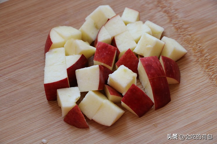 把苹果从中间切开,去掉苹果核以后,将其切成小块儿备用。苹果不要太早切出来,什么时候煮苹果红枣汤就什么时候切,以免氧化变色。如果切好以后不能及时煮制,记得要将其浸泡在淡盐水中防止氧化。