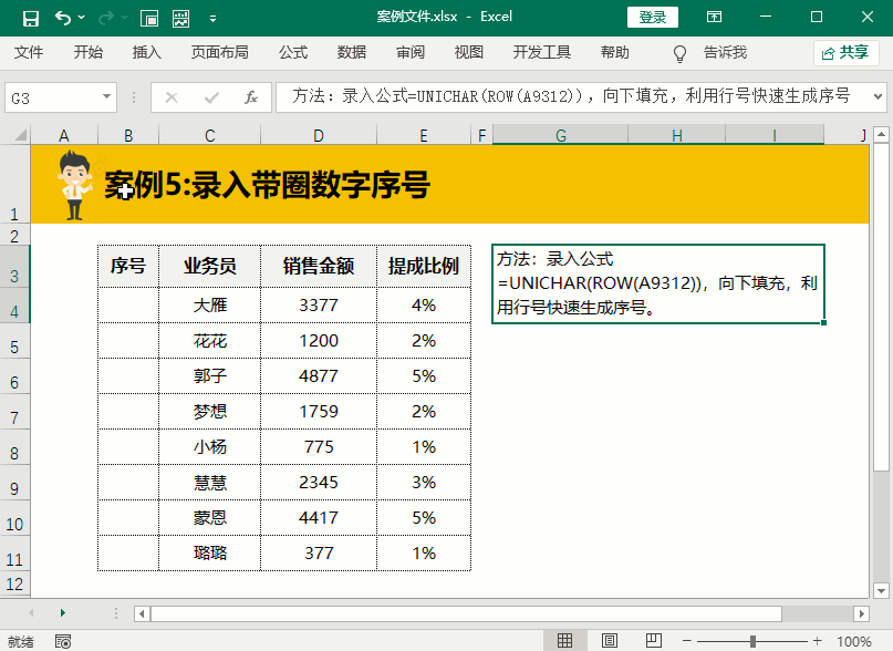 学会了罗马数字的录入技巧,接着来学习一下录入带圈数字的技巧,在B4单元格填充公式=UNICHAR(ROW(A9312))向下填充,原理也是利用ROW函数生成的行号,再用UNICHAR函数转换为带圈序号的方法。