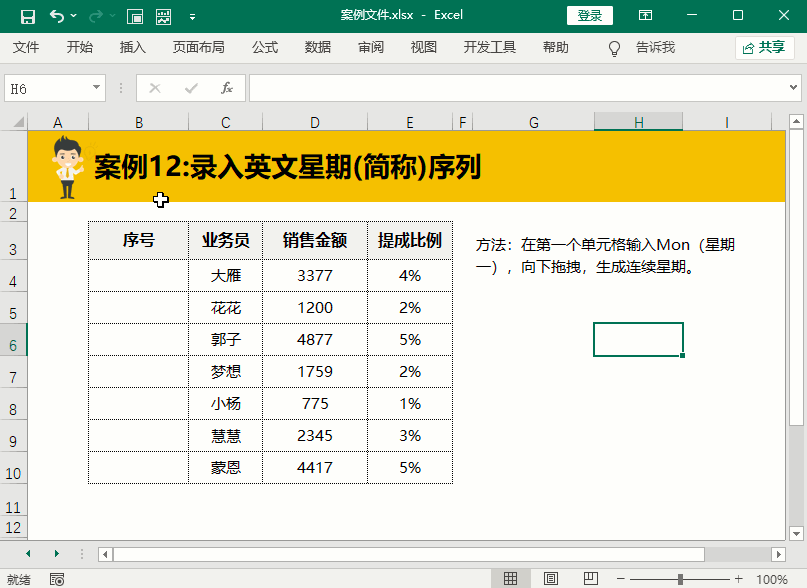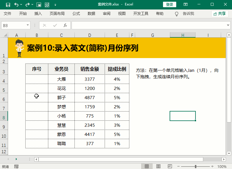 上一个案例是全称的英文月份序列,简称英文月份序列的方法就是输入全称的前三个英文字母然后下拉填充即可。