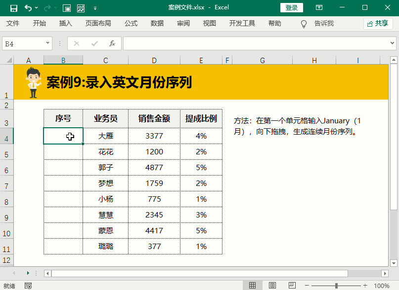 前面介绍了英文月份的序号录入技巧,后来才发现好像漏掉了中文月份的序号录入技巧,所以最后补上一个中文的月份序号录入技巧,在B4单元格录入一月,然后下拉填充即可。