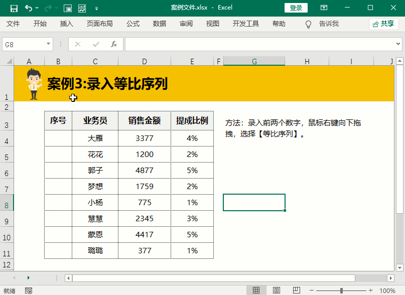 等比例的序号录入技巧是录入前两个数字,选中单元格下拉填充后,点击鼠标右键,选择【等比序列】即可。注意啦,这里是鼠标右键,不是左键哦。