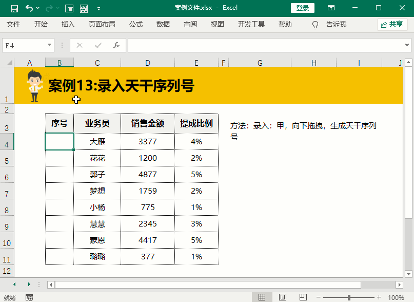 天干这个称呼大家一很少听到过,但是甲乙丙丁我相信大家一定不陌生,案例中经常会遇见。录入技巧在B4单元格中输入甲下拉填充即可生成天干序号。