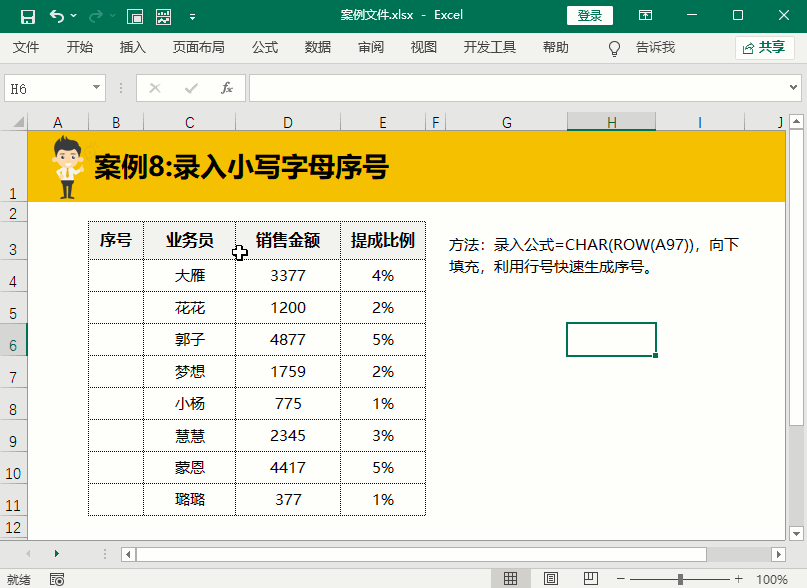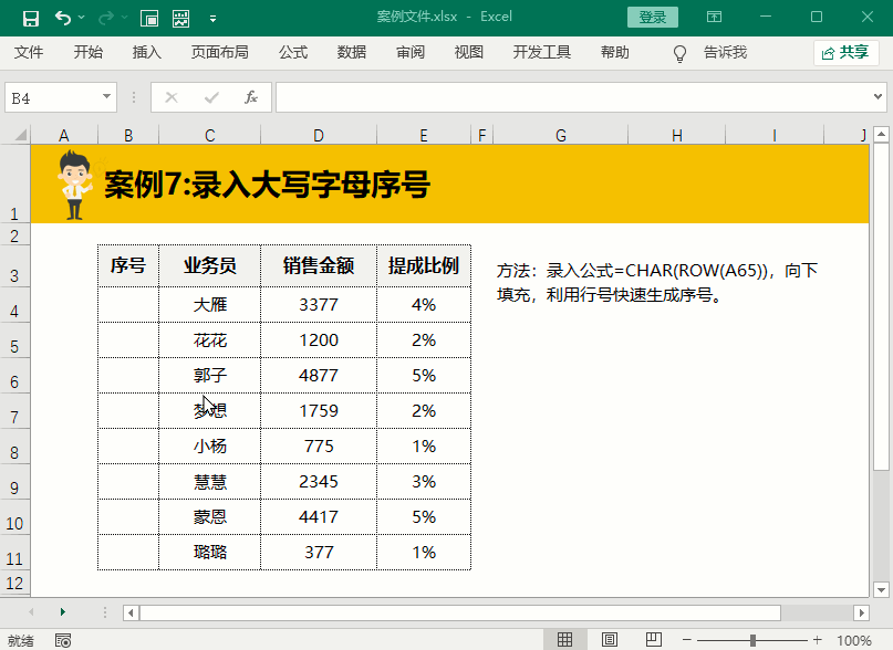 学会了数字序号的录入技巧后,我们再来学习一下如何录入连续的大写字母序号,在B4单元格填充公式=CHAR(ROW(A65))下拉填充即可。