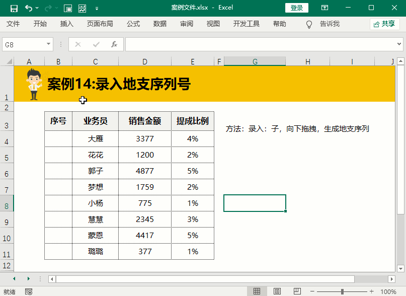地支的序号录入技巧和天干相似,先在B4单元格录入子然后下拉填充即可。