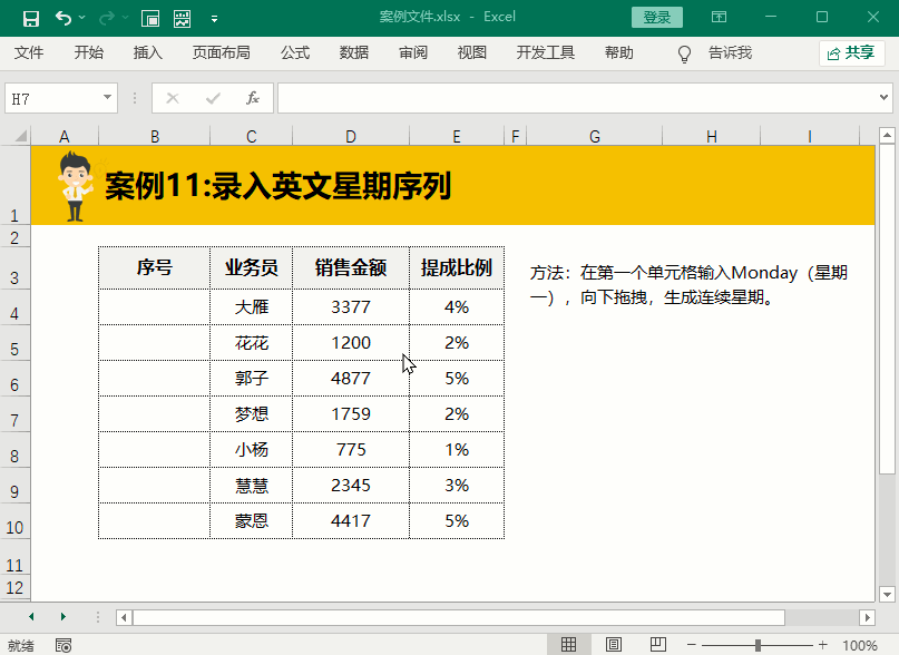 英文的星期序列录入方法和英文月份的录入技巧同理,在单元格中输入英文的星期全称后下拉填充即可。