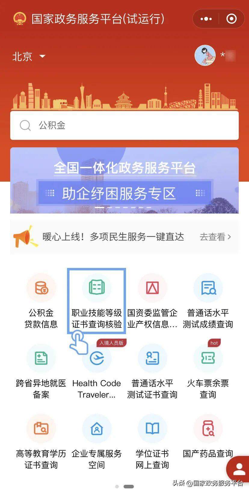 步骤一:微信搜索“国家政务服务平台”,或点击下方葵花码进入小程序,首页找到“职业技能等级证书查询核验”服务。