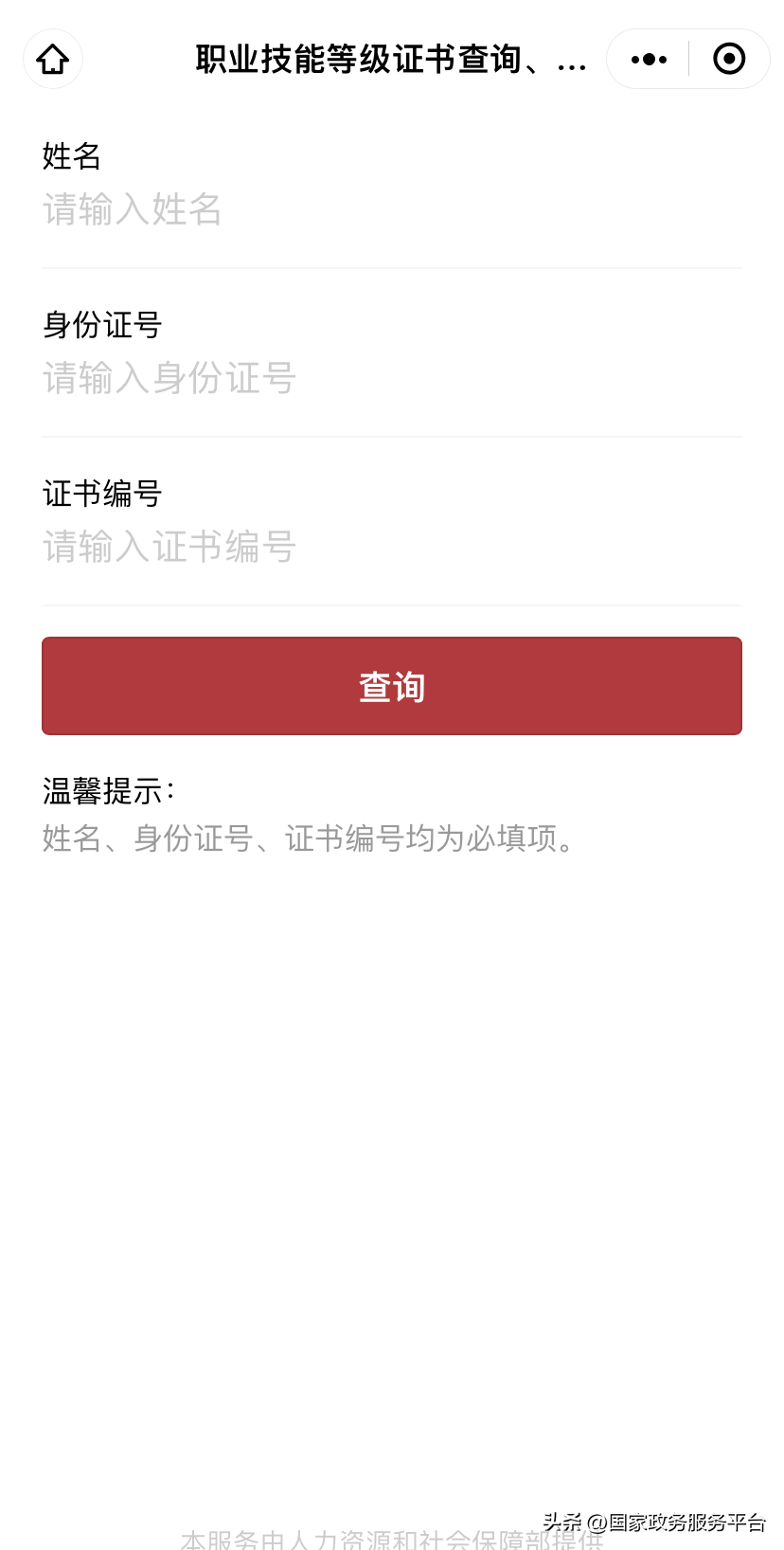 步骤二:进入服务后,输入姓名、身份证号、证书编号,点击查询,即可查看职业名称、职业技能等级、工种名称、发证日期等信息。