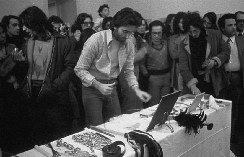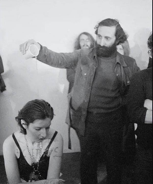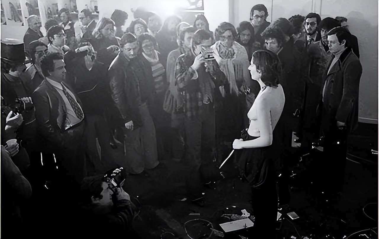 1974年的一个夜晚,意大利那不勒斯艺术节上,一位年轻女子浑身伤痕,满脸泪水,正以赤裸之姿坐在人群中央。