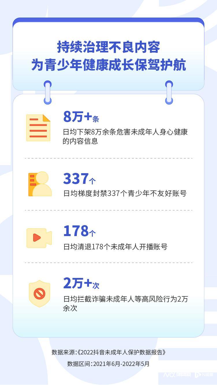 抖音也持续通过技术、产品和运营手段持续治理侵犯未成年人权益的账号和内容。报告显示,2021年6月到2022年5月,抖音平均每天下架8万余条危害未成年人身心健康的内容信息,日均梯度封禁337个青少年不友好账号。另外,抖音每天拦截诈骗未成年人等高风险行为2万余次。
