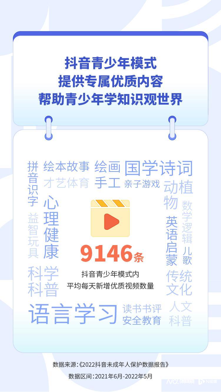 报告显示,去年9月起,抖音推出平台史上最严青少年模式,14岁以下实名认证用户全部进入青少年模式,且无法自行退出。同时,抖音也在持续建设青少年模式优质内容池,在“萌知计划”和“星河知识计划”等助力下,青少年模式内平均每天新增优质内容9146条。