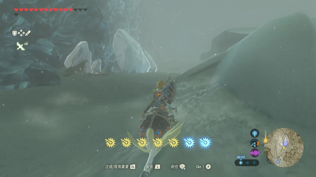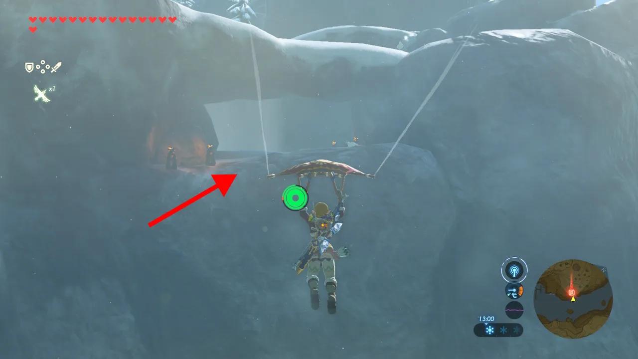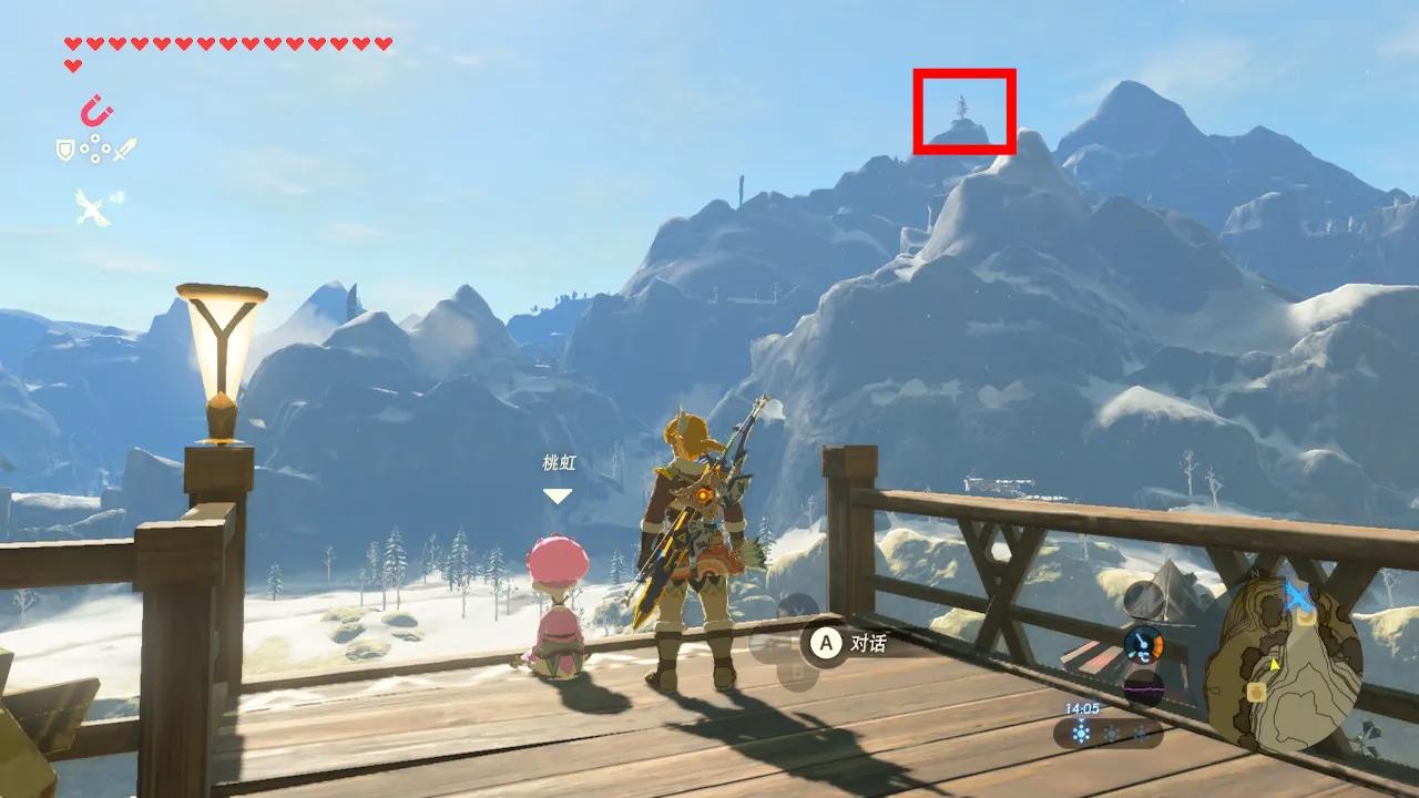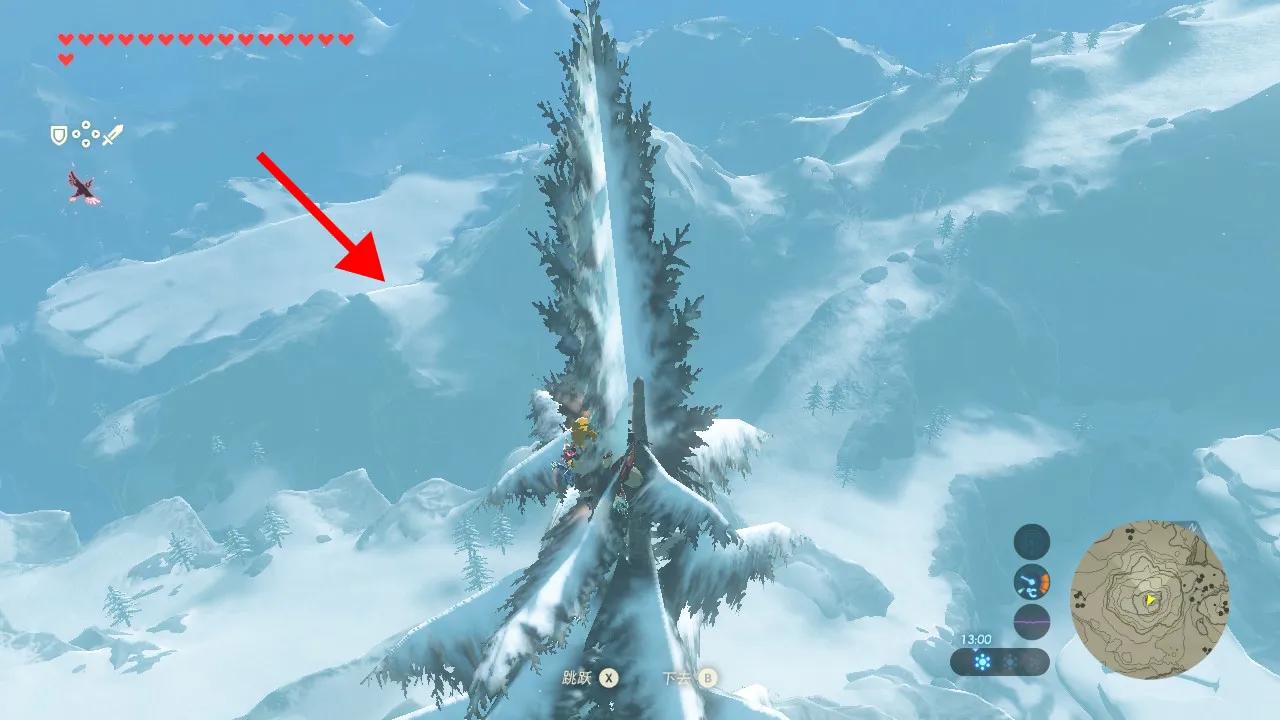 走到山边会看到下面被雪覆盖的伞状的石柱,飞下去就能找到神庙了。