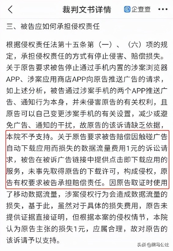 法院也支持了机主的诉求,判决小米赔偿机主因自动下载APP损失的数据流量费一元。