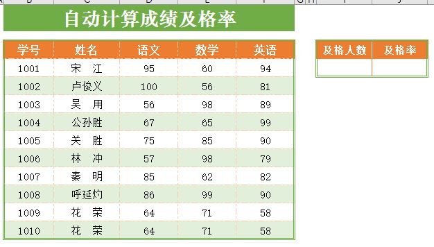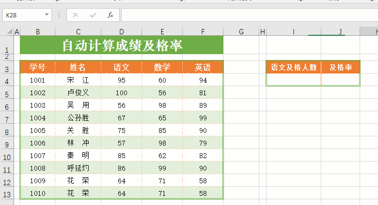 不需要添加辅助列,直接在J4单元格输入公式:=COUNTIF(D4:D13,”>=60″)/COUNT(D4:D13),回车确认后即可计算出语文成绩及格率,演示如下图: