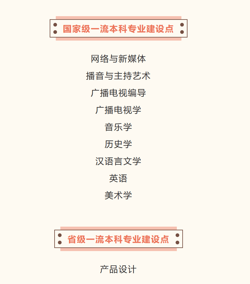 人文艺术类国家级、省级一流本科专业建设点分布于人文学院、新闻与传播学院、音乐舞蹈学院、美术与设计学院、外国语学院。
