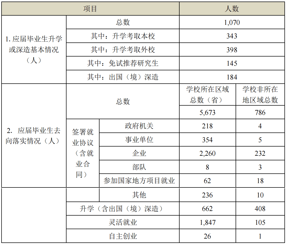 2021 年共有本科毕业生 7,297 人,实际毕业 7,027 人,毕业率为 96.3%,应届本科毕业生学位授予率为 99.93%。截至 2021 年 8 月 31 日,当年应届本科毕业生去向落实率达 91.92%;毕业生最主要的毕业去向是企业,占 38.58%;升学和出国、出境深造的毕业生共 1,070 人,其中出国(境)留学 184 人,占 2.85%。